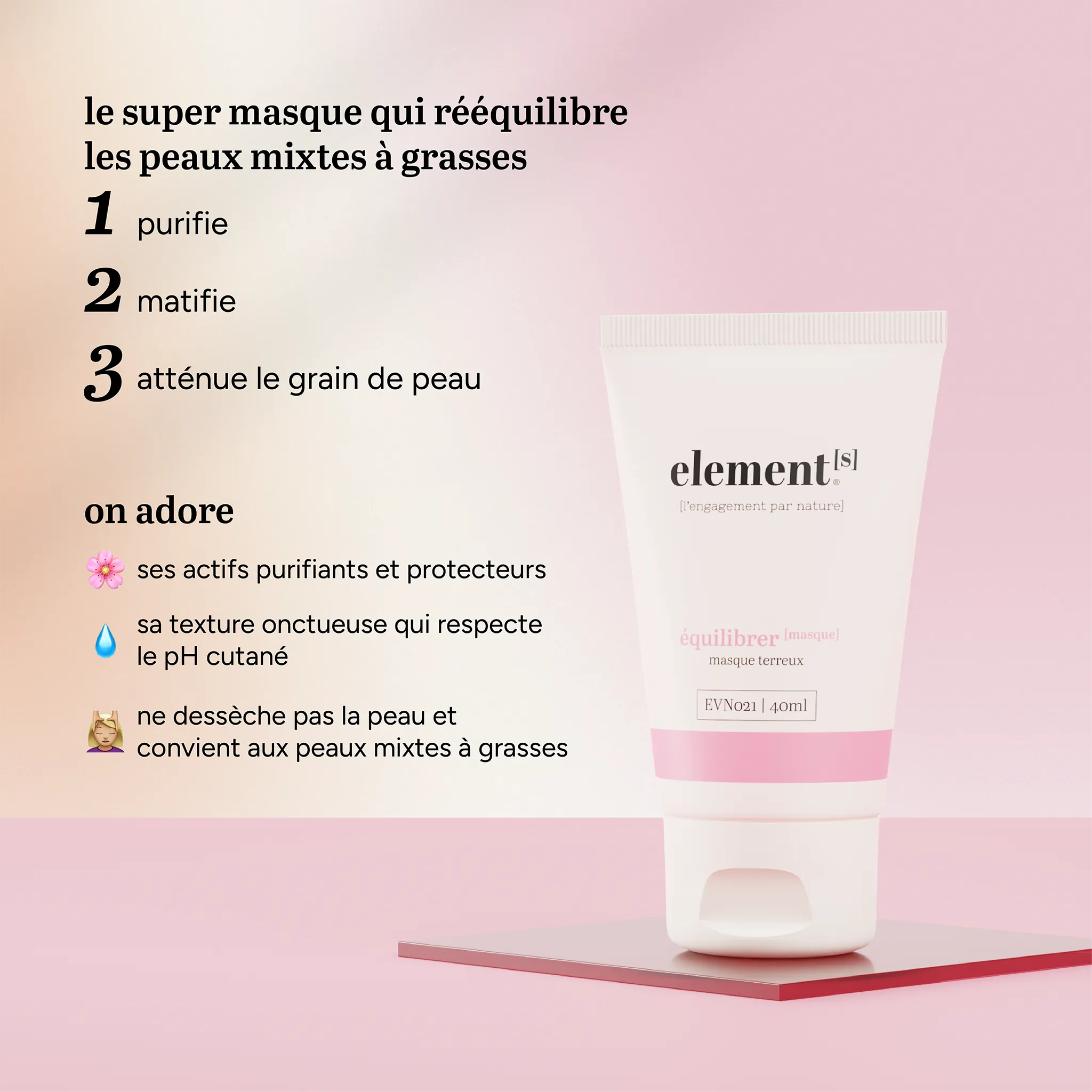 équilibrer [masque] associe des actifs purifiants, absorbants et protecteurs pour rééquilibrer les peaux mixtes à grasses sans les agresser.