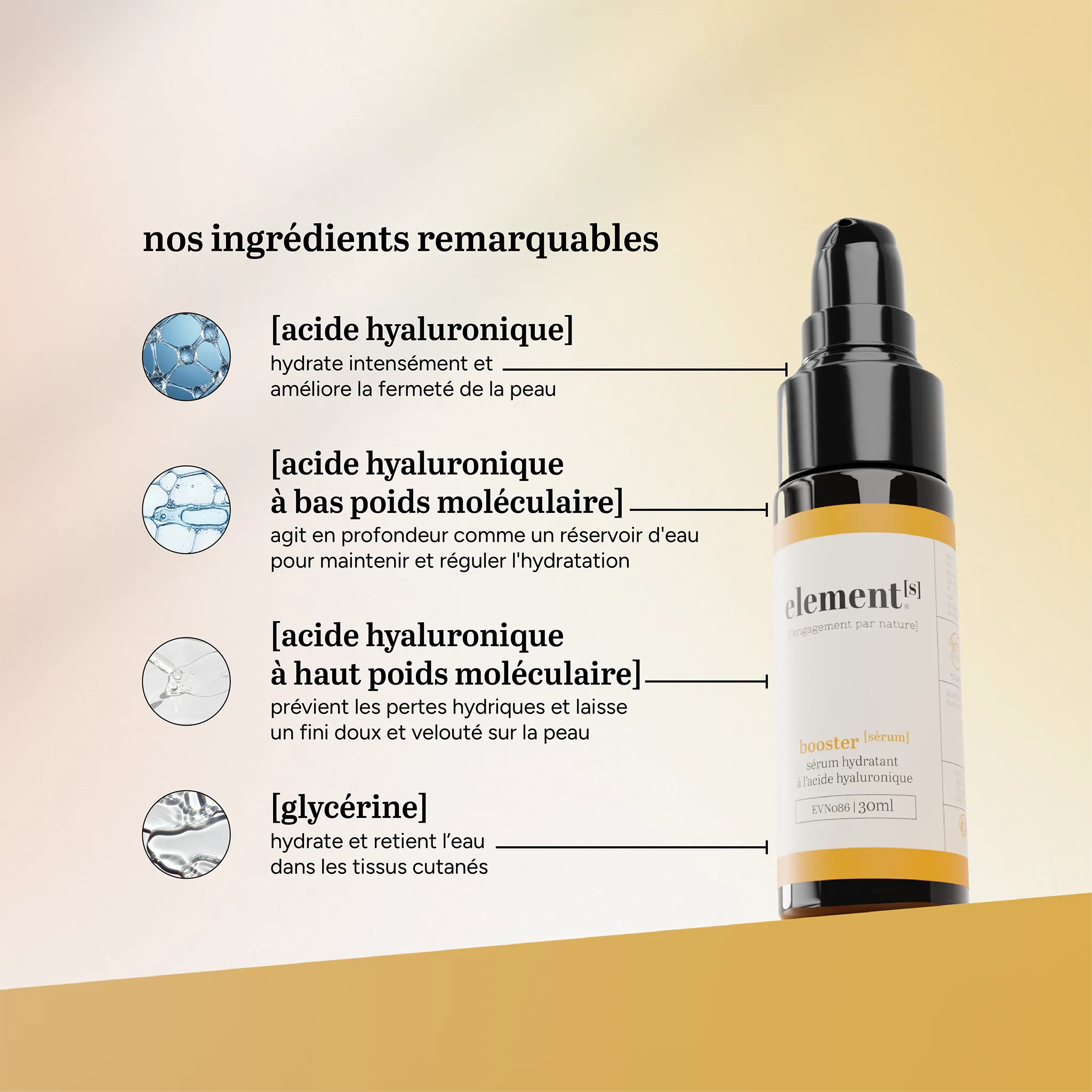 • [Acide hyaluronique à bas poids moléculaire] : agit en profondeur pour repulper et renforcer la barrière cutanée.
