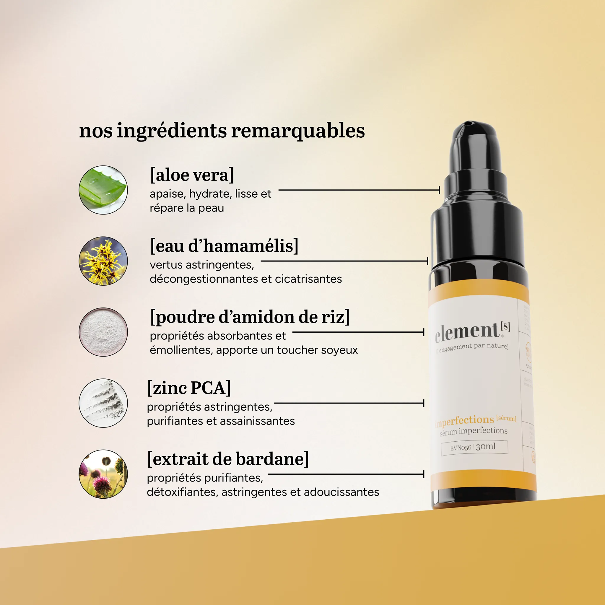 imperfections [sérum] agit efficacement sur les peaux mixtes à grasses grâce à des actifs sébo-régulateurs, astringents et apaisants. Il hydrate sans alourdir, purifie la peau et prévient l’apparition des imperfections.